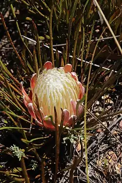 Protea scorzonerifolia, the channel-leaf sugarbush, is a flower-bearing shrub belonging to the genus Protea.[2] The plant is endemic to South Africa and occurs in the Du Toit's Kloof, Franschhoek and Groot-Winterhoek mountains. The plant became extinct on the Cape Peninsula.