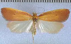 Wing expanse 31 mm. Head and face uniform golden brown, antennae brown. Palpi prominent, upcurved, basal portions pink, the tips yellow. Thorax and crests warm brown. First two pairs of legs pink, hindlegs ochreous. Forewings: costa bowed; apex not obtuse—termen rather rounded. An orange band runs along costa narrowing at base and apex. From the base an orange coloured area extends through centre of wing as far as the discal dot. The rest of the forewing is a warm orange brown deepening to warm brown at the termen. Along the veins thin orange coloured streaks extend out towards the termen. Cilia brown, duller than the main wing colouring. Lower wings silvery white with a pink suffusion along the terminal edge. Cilia pink.[3]