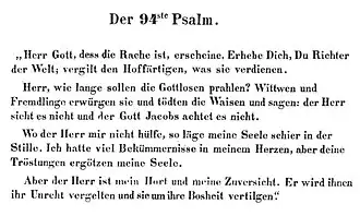Psalm 94 is the 94th psalm of the Book of Psalms, beginning in English in the King James Version: "O LORD God, to whom vengeance belongeth". In the slightly different numbering system used in the Greek Septuagint and Latin Vulgate translations of the Bible, this psalm is Psalm 93. In Latin, it is known as "Deus ultionum".[1] This psalm is referred to as one of the Royal Psalms, Psalms 93–99, praising God as the King of His people, although as Gordon Churchyard notes, God is referred to here as judge rather than king.[2]