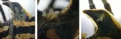 Adult moss millipedes have 19 body segments, each with a pair of wide keels; the coloration of their dorsum ranges from dark brown to black, having two light-colored stripes on the prozonites and metatergites of segments 2-19.[4] The edges of the paranota are white and the legs, antennae and ventral surface of the trunk are reddish brown.