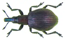 This beetle is 2.8 millimetres (0.11 in) to 4 millimetres (0.16 in) long. Its colour is a metallic purple or copper tone which sometimes includes shades of violet or blue. The body is sparsely covered with tiny white hair. The snout is straight and squat, and is almost identical in both sexes. The short antennae have compact club-like ends. The prothorax is oblong with a small cavity. The forewings on both sides are bulgy with their greatest width in the centre section. They are thinly striped with wide spaces inbetween.