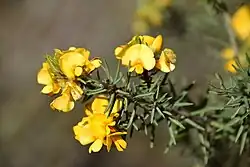 Pultenaea daltonii, commonly known as hoary bush-pea,[2] is a species of flowering plant in the family Fabaceae and is endemic to western Victoria, Australia. It is a spreading shrub with cylindrical leaves, grooved on the upper surface, and clusters of yellow flowers with red markings.