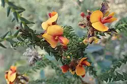 Pultenaea skinneri, commonly known as Skinner's pea,[2] is a species of flowering plant in the family Fabaceae and is endemic to the south-west of Western Australia. It is a slender shrub with simple leaves, and yellow, red and orange flowers with red markings.