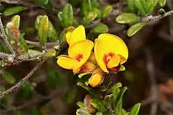 Pultenaea tarik is an erect shrub that typically grows to a height of 0.15–1.5 m (5.9 in – 4 ft 11.1 in) and has hairy, arching branchlets. The leaves are linear to egg-shaped with the narrower end towards the base, mostly 4–22 mm (0.16–0.87 in) long and 2.0–6.5 mm (0.079–0.256 in) wide with stipules 1–2 mm (0.039–0.079 in) long at the base. The upper surface of the leaves is glabrous but the lower surface is hairy. The flowers are borne in dense, leafy groups near the ends of the branchlets, and are 8–12 mm (0.31–0.47 in) long, each flower on a pedicel 1–2 mm (0.039–0.079 in) long with linear, tapering bracteoles 1.5–4 mm (0.059–0.157 in) long at the side of the sepal tube. The sepals are 5.0–6.5 mm (0.20–0.26 in) long, the standard yellow to orange and 8–12 mm (0.31–0.47 in) long, the wings yellow to orange and 8.2–12 mm (0.32–0.47 in) long and the keel red to purple and 10–11 mm (0.39–0.43 in) long. Flowering occurs from September to October and the fruit is a flattened pod 5.5–7.0 mm (0.22–0.28 in) long.[2][3]
