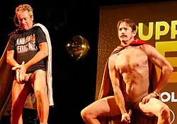 The run-time for the performance is approximately one hour.[14] The main acts are preceded by a 25-minute stand-up comedy act, with varying comedians in different productions.[5][9][14] The majority of the show features a series of 'tricks', which are manipulations of the actors' penises into various forms.[13] The creators describe this as "genital origami".[13] The contortions simulate commonly identifiable shapes, such as objects, architecture and people.[15] The tricks include the Big Mac, the Loch Ness Monster, the wristwatch, the pelican, the Eiffel Tower, the hamburger, the bulldog, the windsurfer and others.[4][6][16][17] The show consists of approximately 45 genital manipulations, accompanied by sound effects and comedic narration.[5][17]