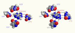 Despite the relative similarity of the purine-binding aptamer domain across different purine riboswitches, one binding pocket can still discriminate for a single type of purine ligand with high selectivity.[7] Critical to this sensitivity is a single difference in the secondary structure of ribonucleotides: in position 74 of the aptamer domain, it has been found that conversion of a cytosine to a uracil changes an aptamer from being guanine sensitive to being adenine sensitive, and vice versa.[7] Such a conversion is owed to the ability of a nucleotide in position 74 to Watson-Crick base pair with the ligand in the binding pocket, and cytosine and uracil's respective ability to preferentially hydrogen-bond with guanine or adenine.[7]