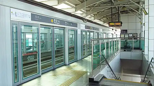 Pyeonggang Station (Korean: 평강역; Hanja: 平江驛) is a station of the BGLRT Line of Busan Metro. The station name comes from the nearest Pyeonggang-ro. The station is located at Daejeo-dong, Gangseo District, Busan, South Korea.