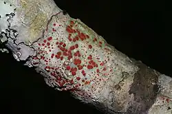 Ramboldia gowardiana is a species of corticolous (bark-dwelling), crustose lichen in the family Ramboldiaceae.[2] First discovered in 2003 in Montana, United States, it typically appears as a grayish or greenish crust on tree bark, particularly on conifers like pines and firs. The lichen is characterised by its small, bright red to orange-red reproductive structures (apothecia) visible on its surface. R. gowardiana is found in dry, temperate forests from Alaska to California, often at elevations between 300 and 1,400 meters (about 980 to 4,600 feet). Initially classified in a different genus, it was reclassified as Ramboldia in 2008 based on genetic studies. This lichen is part of the biodiversity of the Pacific Northwest region of North America.