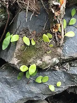Pyrrosia eleagnifolia, commonly known as the leather-leaf fern, or ota in Māori, is a climbing fern endemic to New Zealand. P. eleagnifolia has thick, fleshy rounded leaves, and grows both on the ground and as an epiphyte.
