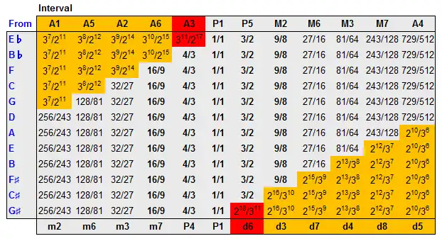 The table shows from which notes some of the above listed intervals can be played on an instrument using a repeated-octave 12-tone scale (such as a piano) tuned with D-based symmetric Pythagorean tuning. Further details about this table can be found in Size of Pythagorean intervals.