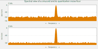 Comparison of quantizing a sinusoid to 64 levels (6 bits) and 256 levels (8 bits). The additive noise created by 6-bit quantization is 12 dB greater than the noise created by 8-bit quantization. When the spectral distribution is flat, as in this example, the 12 dB difference manifests as a measurable difference in the noise floors.