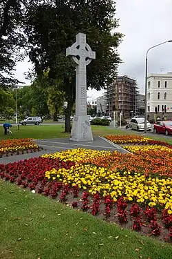 Several notable structures stand within the gardens: a Celtic Cross, symbolising the city's first European settlers and built in 2000 to mark the end of the second Christian millennium, stands at the northern end of the gardens. Statues to Queen Victoria and Donald M. Stuart, one of Dunedin's founding fathers, also stand in the gardens. The gardens are dominated, however, by the city's main war memorial, the 28-metre (92 ft) tall eight-sided column of Dunedin Cenotaph, built between 1924 and 1927.[1] A smaller memorial, listing New Zealand Victoria Cross recipients, stands next to the cenotaph. Several of the trees surrounding the perimeter of Queens Gardens were planted to remember various war anniversaries, and are accompanied by plaques commemorating these events,[2] The gardens are the scene of commemorations on ANZAC Day every April.
