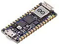 | Nano RP2040 Connect[20] | Arduino | 45×18 | 30 | via pads | 5+4+2 | micro-USB | 16 MB | 1 | Wi-Fi, Bluetooth, 9-axis IMU, microphone | .jpg)  | |||