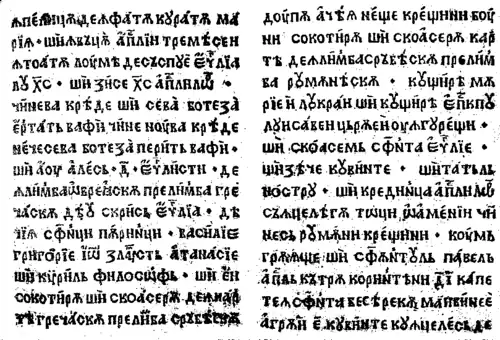During his ten-year reign, Paisie revived Wallachian printing, which still used Church Slavonic rather than preserving the attested vernacular.[168] This reflected his patronage of Serb craftsmen from the Republic of Venice and the Sanjak of Bosnia, including Božidar Vuković and of Božidar Goraždanin's nephew, Dimitrije Ljubavić. Bibliologist Agnes Terezia Erich proposes that, by relocating Ljubavić's press to Târgoviște in 1544, Paisie inaugurated "artisan printing in Wallachia"; however, the enterprise itself was entirely private, the first non-public press in the history of Romania.[169] As Iorga notes, his Early Cyrillic, introduced by Ljubavić for various prayer books, was inferior to the type used in previous decades; the illustrations, instead, were "rather beautiful".[170] The impact of Slavonic as a state language remained high, even though occasionally challenged by Greek. According to archivist Aurelian Sacerdoțeanu, the penetration of Greek at Paisie's court was overestimated because of a single text which survived in Greek translation. The rediscovery of its Slavonic original toned down that claim, although "one could still write in Greek in Wallachia at that time."[171]
