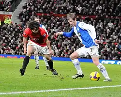 Rafael's first start for Manchester United came on 23 September in their 3–1 home victory over Middlesbrough in the Third Round of the League Cup.[12] Rafael made first start in European competition in United's 3–0 away win over Aalborg BK in the UEFA Champions League on 30 September.[13] Rafael made his first Premier League start in Manchester United's 4–0 home win over West Bromwich Albion on 18 October.[14] On 8 November, Rafael scored his first goal for Manchester United, netting a 90th minute consolation goal in a 2–1 defeat to Arsenal at the Emirates Stadium.[15] On 19 April 2009, in the FA Cup semi-final against Everton, Rafael and his twin brother Fábio started a match together for Manchester United for the first time. United, however, lost the match 4–2 on penalties.[16] At the end of Rafael's first professional season, he and his Manchester United teammate Jonny Evans were shortlisted as nominees for the PFA Young Player of the Year award.[17] The two of them, however, were beaten to the award by Aston Villa's Ashley Young.[18] In recognition of his successful first season in English football, Rafael was handed a two-year extension to his Manchester United contract, tying him to the club until 2013.[19]