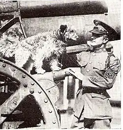 He was adopted into the 1st Division on July 14, 1918, in the Montmartre section of Paris, France. Rags remained its mascot until his death in Washington, D.C., on March 22, 1936.[2] He learned to run messages between the rear headquarters and the front lines, and provided early warning of incoming shells. Rags achieved great notoriety and celebrity war dog fame when he saved many lives in the Meuse-Argonne Campaign by delivering a vital message despite being bombed, gassed, and partially blinded.[3] His adopted owner and handler, Private James Donovan, was seriously wounded and gassed, dying after returning to a military hospital at Fort Sheridan in Chicago. Rags was adopted by the family of Major Raymond W. Hardenbergh there in 1920, moving with them through several transfers until in Fort Hamilton, New York, he was reunited with members of the 18th Infantry Regiment who had known him in France.[4] Rags was presented with a number of medals and awards.