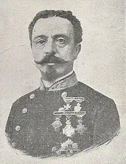 Upon the outbreak of Primera Guerra de Marruecos in 1859 the young Altarriba volunteered to the army; accepted, he was assigned to the Aragon infantry unit of Regimento de Zamora and landed in Ceuta in December 1859.[28] Details of his service are unclear, though he certainly entered many combat actions against the Moroccan troops. Serving under the command of Antonio Ros de Olano[29] in January 1860 he might have taken part in the battle of Castillejos; bypassing Monte Negrón in a dare Spanish maneuver,[30] he then participated in the battle of Cabo Negro.[31] For meritorious service Altarriba was awarded Cruz de San Fernando[32] and got promoted to teniente.[33] Late 1860 the unit returned to the Zaragoza barracks.[34] Apparently enjoying adventurous life and vivacious company, he demonstrated some gift for rhyming couplets;[35] at that time he befriended Nicolas Estevanez Murphy.[36] During the next few years Altarriba continued his military career, though no details are known.