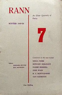 Rann was the first poetry journal ever produced in Northern Ireland.[1] It was founded and edited by Lisburn based writers Roy McFadden and Barbara Hunter in 1948,[2] aiming to provide a platform for young, aspiring poets.[3] The editorial policy was unapologetically regionalist.[4] The title of the periodical means "verse" in Irish.[5] The magazine was published quarterly and ran for five years, with some twenty issues published between 1948 and 1953.[4]