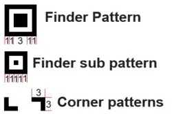 - Corner finder patterns on top-right and bottom-left barcode sides, width and height variable and maximal can be 3x3;