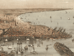 In the 1840s, entrepreneurs began to build ports as the "offloading end" of the Erie Canal. These included the Atlantic Basin, dredged in 1850, and the Erie Basin, dredged in 1864.[6]: 6–7 [7] Simultaneously, in 1849, the New York Legislature granted permission to dredge the nearby Gowanus Creek so it could be used as a 1.5-mile (2.4 km) commercial waterway connected to Upper New York Bay. The creek's dredging was completed in 1860.[14] Another act of the Legislature in 1867 allowed the canal to be deepened further.[15] With the completion of the creek's dredging, Red Hook became an industrial hub, seeing up to 26,000 ships per year.[4][6]: 14