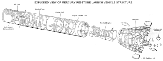 The most visible difference between the Jupiter-C first stage and the Mercury-Redstone was in the section just below the Mercury capsule and above the propellant tanks. This section was known as the aft section, a term which was inherited from the military Redstone. (The actual rear end of the rocket was called the tail section.) The aft section held most of the Mercury-Redstone's electronics and instrumentation, including the guidance system, as well as the adapter for the Mercury capsule.[22] In the military Redstone and the Jupiter-C first stage, when the rocket had burned out, its lower portion, containing the rocket engine and propellant tanks, would separate from the aft section and be discarded, and the aft section, with its guidance system, would direct the top half of the rocket during its unpowered ballistic flight. However, in the Mercury-Redstone, the aft section was permanently attached to the lower portion of the rocket.[23] When the rocket had shut down, the Mercury capsule would separate from the aft section and would rely on its own guidance.