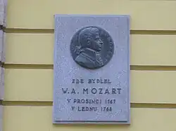 In October 1767, a smallpox epidemic forced Leopold Mozart and his children Wolfgang and Nannerl to escape from Vienna and accept shelter offered by the brother of their patron, Salzburg Archbishop Sigismund von Schrattenbach.[4] On 25 October, Count František Antonín Schrattenbach met with the Mozart family in Brno. He immediately began planning a performance for Wolfgang and Nannerl. However, Leopold Mozart decided to continue travelling, and the family went on to Olomouc. Unfortunately, the epidemic affected young Wolfgang, and they had to stay in Olomouc until his recovery. On 24 December, they came back to Brno and spent Christmas there. On 30 December 1767, the child prodigies performed in the Taverna Theatre.[5] According to a diary entry by Aurelius Augustin, provost of the monastery in Šternberk: