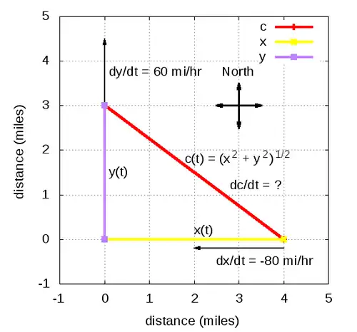 For example, one can consider the kinematics problem where one vehicle is heading West toward an intersection at 80 miles per hour while another is heading North away from the intersection at 60 miles per hour. One can ask whether the vehicles are getting closer or further apart and at what rate at the moment when the North bound vehicle is 3 miles North of the intersection and the West bound vehicle is 4 miles East of the intersection.