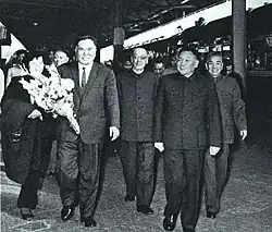 Meanwhile, China, amid rising military tensions with the United States due to the escalating Vietnam War and the Sino-Soviet border conflict that culminated in a military confrontation in 1969, relations with Tokyo became a dangerous factor threatening China's political status and, in some cases, their lives. Sino-Japanese relations grew much more hostile and distrustful by the late 1960s. Dong Biwu maintained his authority as one of the few CCP members who had remained there since its founding, and Zhou Enlai, who had studied in Japan, continued to enjoy Mao's firm trust in administrative matters as Premier of the State Council. However, others, such as Liao Chengzhi, Chairman of the China-Japan Friendship Association, who was born in Tokyo and spent his childhood in Japan, despite having criticized the JCP, did not escape disgrace, being considered by Mao as "pro-Japanese." Subsequently, Mao's foreign policy took a radical turn with the visit of US President Richard Nixon to China in 1972, and in October of that year, Prime Minister Kakuei Tanaka also visited China. In Beijing, Tanaka and Zhou issued a joint statement, which achieved the normalization of diplomatic relations between Japan and China. Although Liao Chengzhi, who served as interpreter, was reinstated in power, relations between the Japanese and Chinese Communist Parties did not improve. The dialogue diplomacy that paved the way for the restoration of diplomatic relations was carried out by the Japan Socialist Party, which as a whole enjoyed friendly relations with the CCP due in part to the influence of the pro-China group on the party's left wing, and by the Komeito, which, despite its right-wing line, had Sinophile tendencies and whose chairman, Yoshikatsu Takeiri, had received a personal letter from Zhou in Beijing three months before Tanaka's visit.[22] With the deaths of Zhou and Mao in 1976, the CCP ended the Cultural Revolution and removed Hua Guofeng as Chairman of the Central Committee of the Chinese Communist Party, ushering in a system in which Deng Xiaoping, who adopted the same pragmatic and modernizing approach as Zhou, emerged as the new supreme leader. However, the conflict between the CCP and the JCP continued, and when Japanese parliamentary delegations visited China, the JCP members were rejected by the Chinese side. However, unlike the Liberal Democratic Party (LDP), which had a group within the party that still strongly resisted the normalization of diplomatic relations between Japan and China and which maintained close ties with Taiwan even after normalization, there was no possibility for the JCP to have friendly relations with Chiang Kai-shek, who advocated the most violent anti-communism, or with Taiwan in general, where martial law continued and KMT one-party rule continued even after his death in 1975. Ultimately, the JCP was unable to exert any real influence on China issues, and although it harshly criticized the CCP for years, it continued to support the party's "One China" principle, which aims for unification with Taiwan under the People's Republic. In 1978, Prime Minister Takeo Fukuda signed the Japan-China Treaty of Peace and Friendship. In a debate at the plenary session of the House of Councillors on October 18, 1978, JCP member Hiroshi Tachiki criticized China for "attempting to impose a policy of armed struggle on Japanese people's movements for the past decade or so and for engaging in acts of great-power hegemonism." He then argued for ratification on behalf of the JCP, arguing that the Japanese government had confirmed that China's refusal to allow members of its own party to visit China, as well as its support for pro-China, anti-JCP New Left groups in Japan, constituted interference in Japan's internal affairs and thus fell within the hegemonism opposed by the treaty.[23]