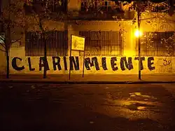 The union leader Hugo Moyano, who supported the Kirchners at that point, attended a Kirchnerite political rally with a banner that reads "Clarín miente" (Spanish: Clarín lies), in reference to the Clarín newspaper. It was incorporated to the "Relato K" as a frequent slogan. It was not used for specific news published by Clarín, but to make reference to the newspaper as a whole, to discredit it. Despite the defamation campaign, Clarín is still the highest sold Argentine newspaper.[42]