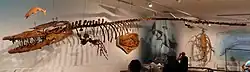Additional largely complete skeletons of T. proriger and T. dyspelor were uncovered from the Niobrara Formation between the 1900s to 1920s by Charles Sternberg and his son George, which were sold to museums in the United States and Germany.[43] A particular find was a T. proriger skeleton collected by C. Sternberg from Smoky Hill Chalk deposits in Logan County, Kansas, in 1917, which contained digested remains of a plesiosaur within its ribcage. The specimen was sold the following year to the Smithsonian, and the mosasaur has been permanently displayed as USNM 8898.[44][45] The plesiosaur remains, despite their significance, were stashed as a separate specimen and promptly forgotten until their redescription by Everhart in 2004.[46] This rediscovery formed the basis for the plot of the 2007 National Geographic film Sea Monsters: A Prehistoric Adventure.[45] George Sternberg attempted to sell another complete T. proriger skeleton he found to the Smithsonian 1926, but the museum was satisfied with his father's earlier specimen and declined the offer. This skeleton was ultimately transferred to the Sternberg Museum as FHSM VP-3.[47]