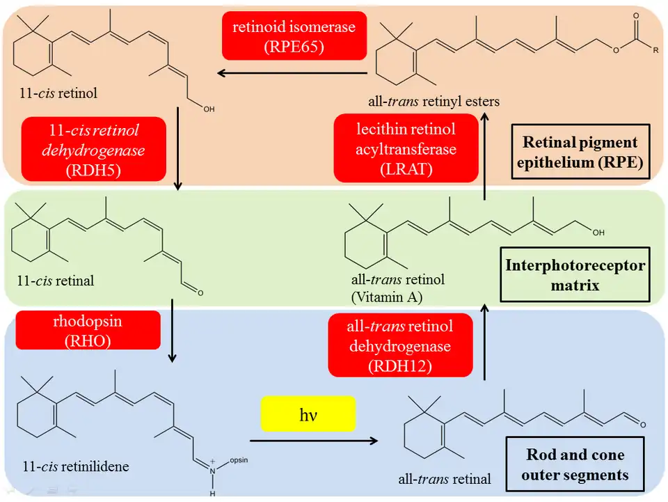 Retinoid dehydrogenases/reductases (oxidoreductases), including retinol dehydrogenase, catalyze the key oxidation-reduction reactions in the visual cycle, converting vitamin A to 11-cis retinal, which is the chromophore of the rod and cone photoreceptors. It is believed that RDHs at rod and cone are different, but related and can catalyze the same reaction. RDH12 is the primary enzyme that reduces all-trans retinal released from bleached photopigments during recovery phase in the visual cycle. The RDH12 enzyme can use either cis or trans retinoid isomers as substrates and can also function as both dehydrogenase (i.e. retinol to retinal) and reductase (i.e. retinal to retinol).[12][13]