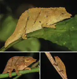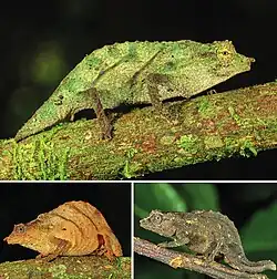 Rhampholeon (from Greek: ῥάμφος rhamphos, 'bird's bill' and Greek: λέον leōn, 'lion')[1] is a genus of small chameleons, commonly known as pygmy chameleons or African leaf chameleons, found in East Africa and Central Africa. They are found in forests, woodlands, thickets, and savanna, and most species are restricted to highlands. They are brown, grey, or green, and typically seen at low levels in bushes, or on the ground among grasses or leaf litter.
