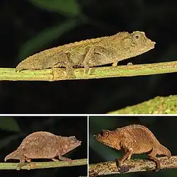 ![]() | Rhampholeon spectrum (Buchholz, 1874) | spectral pygmy chameleon, western pygmy chameleon, Cameroon stumptail chameleon | Cameroon, Equatorial Guinea, Central African Republic, the Republic of the Congo, Nigeria, and Gabon, |