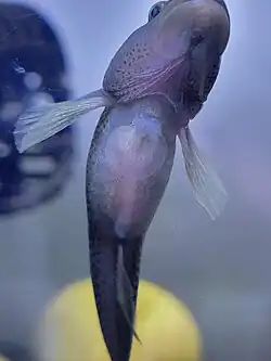 Rhinogobius niger is a freshwater benthic fish with united pelvic fins that form a sucking disk.[2] It can be distinguished from its congeners by its lack of a cheek stripe, and by two horizontal reddish brown stripes running front to back on the head just behind the eyes. Additionally, males have small reddish orange spots as adults, and all R. niger have a large black mark on the first dorsal fin. Adult fish measure 28.3–42.3 mm (1.1–2.7 in) SL.[1][2]