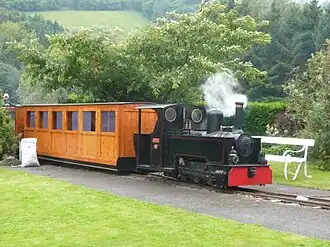 There are two resident steam locomotives. 'Powys' is a powerful 0-6-2T engine, built in 1973 by Severn Lamb.[5] 'Jack' is a large 0-4-0 tender engine, constructed by TMA Engineering of Birmingham and Jack Woodroffe of Welshpool in 2003. An assortment of wooden passenger carriages (both bogie carriages and four-wheel vehicles) and wagons is available on the line.