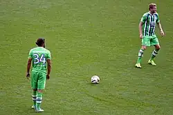 He scored his first ever goal in European football for Wolfsburg on 18 September 2014, netting directly from a free-kick after having previously scored an own-goal in a 4–1 defeat to English side Everton.[33] Three days later, Rodriguez scored twice more for Wolfsburg, once from the penalty spot and a volley from a Kevin De Bruyne corner, as Wolfsburg defeated Bayer Leverkusen 4–1.[34] He scored his third league goal of the season against Werder Bremen on 27 September, converting a De Bruyne cross to put Wolfsburg up 1–0 in an eventual 2–1 victory.[35]