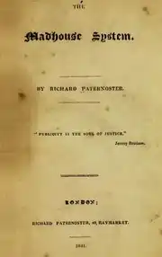 While he was in Kensington House, Paternoster kept notes of his treatment. Once released he researched parliamentary reports, visited asylums and contacted other patients and wrote a series of articles for the London magazine The Satirist. In 1841 he published these in the form of a book, The Madhouse System.