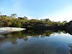 The park covers part of the Espinhaço Mountains. It has a rugged relief with quartz rocks that form beautiful cliffs. The park holds several springs, notably that of the Rio Preto, one of the main tributaries of the Araçuaí River, which in turn is a tributary of the Jequitinhonha River. The abundant watercourses form waterfalls, natural pools, rapids, sinkholes, canyons and fluvial beaches with white sands.[1]