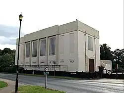 The river plays an important role in the supply of drinking water to residents of Essex. Langham Mill had ceased to operate by 1924, and in 1928 South Essex Waterworks (now Essex and Suffolk Water) obtained an act of Parliament, the South Essex Waterworks Act 1928 (18 & 19 Geo. 5. c. lxxix) granting them permission to demolish it, in order to construct a pumping station on the site. It was licensed to abstract 12 million imperial gallons (55 Ml) per day,[69] which was treated at a works to the west, and then pumped to a reservoir at Danbury, from where it flowed to another reservoir at Herongate, supplying customers in Romford, Ilford and Barking, Essex, in what is now part of Greater London.[70] Reconstruction of the locks at Stratford, Dedham, Flatford and Brantham was a condition of the planning consent for the works.[69] Although not a listed building, the pumping station was added to the Local List in 2020. It is constructed of concrete with a pitched roof, in the International Modernist style popular at the time, and is painted white. At the treatment works, the control room, primary filter house and chemical house are all built in the same Modernist style, and were listed because they form a good example of the style in largely unaltered form.[71] There is a detached house and six semi-detached houses built in a similar style to the south of the works, probably designed as housing for the staff, and a service reservoir to the east with its own Modernist pumping station.[72]
