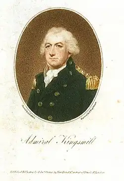 Admiral Sir Robert Brice Kingsmill, 1st Baronet (1730 – 23 November 1805) was an officer of the Royal Navy who served during the Seven Years' War, the American War of Independence and the French Revolutionary and Napoleonic Wars in a career that spanned nearly 60 years. Kingsmill was a contemporary and close friend of Lord Nelson, and was one of the prominent Royal Navy admirals of his time referred to as "The Conquerors of the Seas", illustrated in Piercy Roberts' 1800 engraving. He served with Rodney in the West Indies, where he was wounded in battle, and with Keppel at the Battle of Ushant. He took the time to embark on a career in politics as a Member of Parliament, giving this up several times to resume his service in the Navy when war broke out. Kingsmill rose to flag rank by the time of the outbreak of war with revolutionary France in 1793. As the naval commander-in-chief on the coast of Ireland, he repelled several attempts by the French to invade Ireland and foment insurrection. Kingsmill died on 23 November 1805 at Sydmonton Court as a baronet and with the rank of Admiral of the Blue.