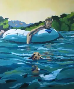 The representational style of Brokl's early work in the 1970s reflected his interest in recording and expressing his experience as a gay man, as well as the influence of California, and often depicted naturally lit people at leisure and on the beach.[23] Prior to earning his MFA degree, he frequently drew critical attention for paintings and works on paper in juried annuals and group exhibitions, including notices from Bay Area critics Victoria Dalkey, Cathy Curtis and Thomas Albright and The Advocate for the rawness and "blunt strength"[35] of his figurative work and leisurely, off-guard nudes (e.g., Self-Portrait with Pink Sky and Al and Ludwig – Russian River, both 1980).[36][37][25][23]