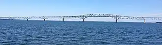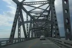 The Robert Opie Norris Jr. Bridge (known to the public as "The White Stone Bridge") is a truss bridge that spans the Rappahannock River in Virginia, United States and serves as the crossing for State Route 3 over the river between Grey's Point on the Middlesex County side and the town of White Stone in Lancaster County. The span was opened on August 30, 1957, and replaced a ferry service directly West of where the current bridge is located. Commonly known by locals as the White Stone Bridge or Rappahannock River Bridge, this span is a critical crossing between the Lower Middle Peninsula and the Northern Neck as the next closest crossing is over 30 miles (48 km) upstream near Tappahannock. Traffic forced to utilize a detour over the upstream crossing could potentially travel over 90 miles (140 km). The Norris Bridge is 11,237 feet (3,425 m) long,[1] and provides a Mean High Water clearance of 110 feet (34 m) under the center span with a channel depth of over 60 feet (18 m). The bridge is maintained by the Virginia Department of Transportation. When first opened, the bridge was crossed by just over 1,000 vehicles per day, on average. Tolls were removed from the bridge in 1976, and by 1978 the average daily traffic had risen to over 2,500 vehicles per day. By 2006, traffic counts reached 11,309 vehicles per day[2] but shrank to 6,900 Annual Average Daily Traffic in 2017.[3]