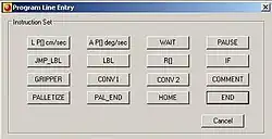 The RoboLogix instruction set contains 16 commands, which are usually written as a program on a line-by-line basis. These commands are used to instruct the robot to perform tasks such as moving to a specific location, picking up an object, executing a subroutine, waiting, etc. One of the more popular commands in the instruction set is the IF instruction, which compares numerical values located in two registers. If a register has a value that is greater than (>), less than (<), greater than/equal to (>=), less than/equal to (<=), equal to (=), or not equal to (<>) another register, it will execute the next line in the program if the condition is true. The IF command is often used with the JMP LBL instruction to control program execution.