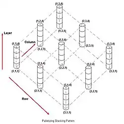 Palletizing is one of the more popular applications for robots, and is accomplished by combining a series of commands into a palletizing routine. A RoboLogix palletizing routine consists of five program instructions, or lines. The first instruction is the Palletize instruction, which is followed by a linear motion instruction to move to the stack point. The stack point is the top-center of the workpiece, and a group of stack points forms a stacking pattern, as shown in the adjacent image. The first stack point in a stacking pattern is located at (1,1,1) (row, column, layer) and is incremented each time the palletizing routine is executed.