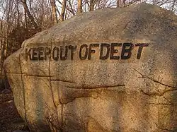 Babson was interested in the history of an abandoned settlement in Gloucester known as Dogtown. To provide charitable assistance to unemployed stonecutters in Gloucester during the Great Depression, Babson commissioned them to carve inspirational inscriptions on approximately two dozen boulders in the area surrounding Dogtown Common. The Babson Boulder Trail exists today as a well-known hiking and mountain-biking trail. The inscriptions are clearly visible. The boulders are scattered, not all are on the trail, and not all of the inscriptions face it, making finding them something of a challenge. Samples of some of the two dozen inscriptions include "Help Mother," "Spiritual Power," "Get A Job," "Keep Out Of Debt," and "Loyalty."[15][16]