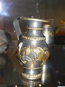It consists of 165 receptacles, including 108 phiales, 55 jugs and 3 goblets.[2] The objects are silver with golden gilt on some of them with total weight of more than 20 kilograms (44 lb). The treasure is an invaluable source of information for the life of the Thracians, due to the variety of motifs in the richly decorated objects. It is dated back to the 5th–4th centuries B.C.