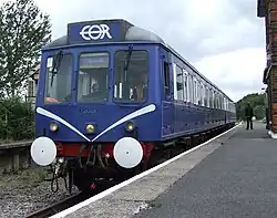 | British Rail | Unit DMBS 51342 and DMS 51384 Set No - | Class 117 | The railway has the two driving cars from what was a three-car Class 117 DMU. There were 127 of this type of vehicle and they were delivered new in 1959 to Southall depot working services between Paddington and the suburbs. They continued to be based in the London area until withdrawal in the 1990s, they arrived at the Railway in 2004. Each coach has two Leyland diesel engines underneath, which drive the wheels mechanically through a fluid flywheel. The driver's cab at each end of the unit means it can be driven from either end, making it ideal when running to Coopersale, and speeding up turn-around times. The windows in the ends mean passengers in either coach get an excellent view of the line ahead or behind and also get to watch the driver in action. The unit ran in an unusual dark blue and white 'EOR' livery until 2007, when it was taken out of service by the new owner when services were suspended. The interior has been refurbished, the unit is receiving attention to the exterior bodywork. DMBS is being restored; DMS is in service twinned with a Class 121 unpowered driving trailer.[16] | | DMBS is being restored; DMS operational. |