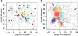 - ^ a b Myres, N. M.; Rootsi, S; Lin, A. A.; Järve, M; King, R. J.; Kutuev, I; Cabrera, V. M.; Khusnutdinova, E. K.; Pshenichnov, A; Yunusbayev, B; Balanovsky, O; Balanovska, E; Rudan, P; Baldovic, M; Herrera, R. J.; Chiaroni, J; Di Cristofaro, J; Villems, R; Kivisild, T; Underhill, P. A. (2010). "A major Y-chromosome haplogroup R1b Holocene era founder effect in Central and Western Europe". European Journal of Human Genetics. 19 (1): 95–101. doi:10.1038/ejhg.2010.146. PMC 3039512. PMID 20736979.