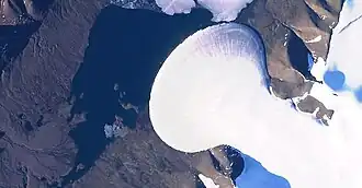 Romer Lake is famous for its impressive Elephant Foot Glacier, a wide piedmont glacier with a strikingly-shaped 5.4 kilometres (3 mi) wide terminal lobe flowing into the lake from the SE in its central part.[1][4]