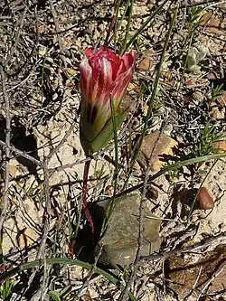 Romulea sabulosa is a perennial geophyte that is assigned to the family Iridaceae. It has a few grooved thread-like leaves, and relatively large burgundy red trimerous flowers, reminiscent of crocus flowers, with yellow to light greenish with black markings and stamens with light green free filaments. It only occurs on sandy clay on renosterveld west of Nieuwoudtville in the Northern Cape province South Africa. It is called satynblom in Afrikaans.[1]